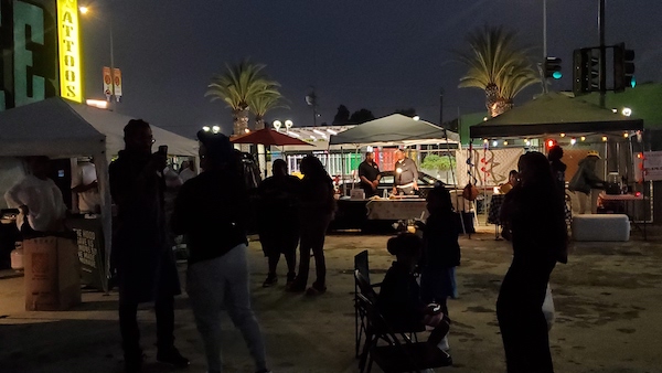 The Harbor area is not without its own night market! Since 2022, over 30 food and merch vendors informally gather around the Metro (J) Line park and ride lot on Pacific Coast Highway and Figueroa Street every Friday-Sunday evening. The food selections include Mexican regional, Salvadoran (pupusas), Honduran (pollo con tajadas), aguas frescas, churros, street dogs/elotes, crepes and mini-pancakes. One unnamed taco stand along PCH seems to be the big draw here, with a line several yards long. Their handmade tortillas and huge trompo might be the reason why. Though most of the vendors set up along the sidwalk, a few of them set up within the parking lot, some of whom literally sell from the trunks of their parked cars. One queso vendor roams the market with a rolling cooler full of cheeses. The Militant has to mention that car traffic along PCH and Figueroa is dangerously fast, and even cars maneuvering within the parking lot seem to be speeding by a little too fast for comfort. Whatup wid dat, Dub City?